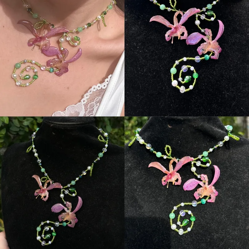 2 orquídeas encapsuladas en resina que combinamos con swarovski perlas ojo de gato y jade verde.. trabajado con alambrado en espiral y con cierres enchapados en oro de 14 kilates para mayor durabilidad