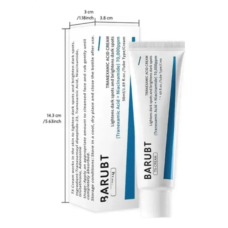 Este es un tubo de crema facial con ácido tranexámico BARUBT TX-Cream. La BARUBT TX-Cream es un producto cosmético de Corea del Sur formulado para aclarar y dar brillo a la piel, específicamente para tratar manchas oscuras, hiperpigmentación y marcas de acné. Características clave Ingredientes Activos: Contiene ácido tranexámico y niacinamida, con una concentración combinada de 70,000 ppm. Beneficios: Ayuda a reducir la apariencia de pecas, manchas y otras decoloraciones de la piel. Promueve un tono de piel más uniforme y una tez radiante. Mejora la función barrera de la piel y proporciona hidratación gracias a ingredientes como el ácido hialurónico y péptidos de colágeno. Textura y Uso: Tiene una textura suave y cremosa que no es pesada ni pegajosa, adecuada para todo tipo de pieles y para uso diario (día y noche). Formulación: Está formulada sin fragancias ni colorantes artificiales, lo que la hace menos irritante. La combinación de ácido tranexámico y niacinamida es potente para combatir la pigmentación desde diferentes ángulos, resultando en una piel más clara y luminosa. Ingredientes principales: Ácido tranexámico y niacinamida (70,000 ppm). Función: Aclara y reduce la apariencia de las manchas oscuras en la piel. Presentación: Tubo de 50 ml (1.69 fl.oz.). Tipo de piel: Se enfoca en todo tipo de manchas de origen melánico, especialmente aquellas resistentes como el melasma.
