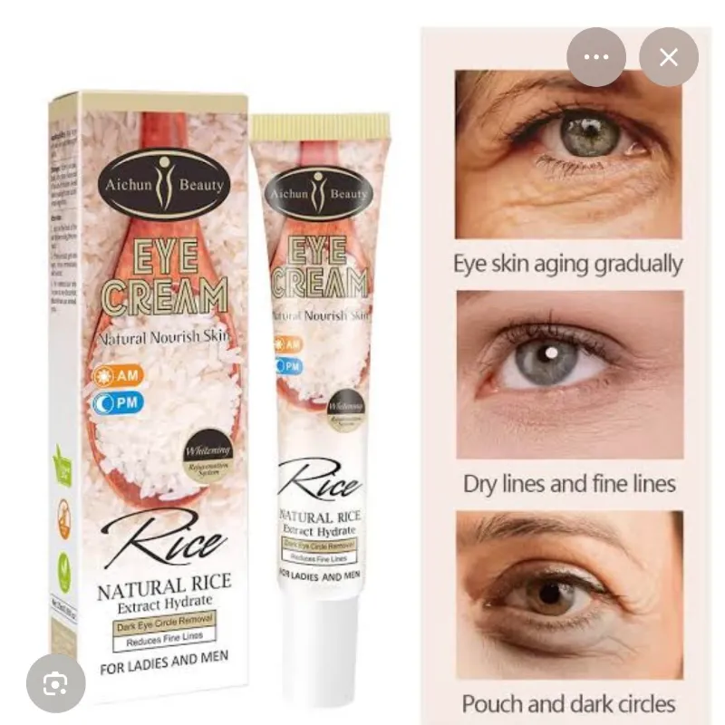 Aichun Beauty Crema de eliminación de bolsas de ojos de arroz Rice Eyes: enriquecida con esencia vegetal extraída del arroz, esta crema para los ojos para el cuidado de la piel fue desarrollada para las ojeras y la hinchazón debajo de los ojos y tiene como objetivo hidratar la piel alrededor de los ojos. Una crema para ojos blanqueadora con esencia de arroz.