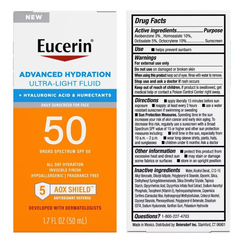 Eucerin Sun Advanced Hydration Face Sun es una loción de protección solar ultraligera enriquecida con ácido hialurónico y humectantes para una piel hidratada y de aspecto saludable. Deja la piel radiante y sintiéndose fresca y fresca con una sensación de peso y sedosa. El protector solar diario SPF 50 presenta protección solar UVA/UVB de amplio espectro más un complejo antioxidante avanzado, 5 AOX Shield, que va más allá de la neutralización para proteger también de los radicales libres y ayudar a mantener la salud de la piel. Con una textura fluida ultraligera, esta loción facial de protección solar se mezcla rápidamente y tiene un acabado invisible que es ideal para el uso diario debajo del maquillaje. Desarrollado con dermatólogos, este protector solar facial hipoalergénico no es comedogénico (no obstruye los poros) y es adecuado para todo tipo de piel. Eucerin Sun es la única marca dermatológica de cuidado solar enriquecida con 5 antioxidantes para ayudar a defenderse del daño solar a largo plazo.
