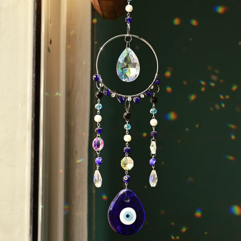 Un atrapasol delicado y lleno de intenciรณn, donde la luz se transforma en pequeรฑos destellos de magia. En el centro, un cristal facetado capta el sol y lo dispersa en arcoรญris que llenan el espacio de energรญa y calma. Sus cadenas de cuentas en tonos profundos y luminosos descienden con elegancia hasta la parte mรกs importante de esta pieza ๐งฟ El Ojo Turco, sรญmbolo de protecciรณn y equilibrio ๐โจ๐