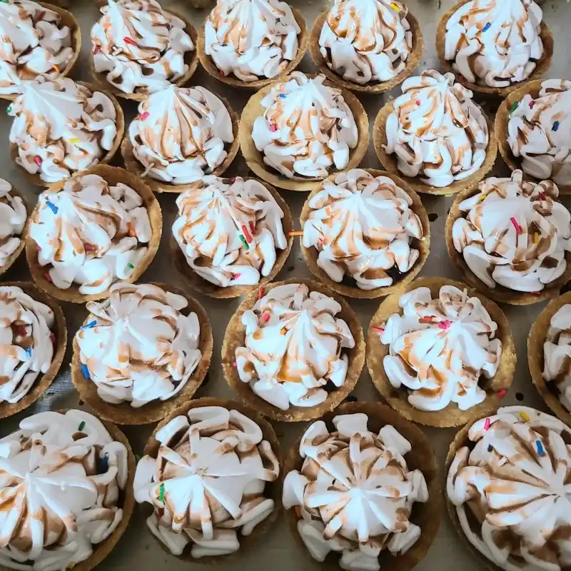 Deliciosas y crugientes tartaletas vestidas con sedoso y exquisito supernortemul, con grajeas.