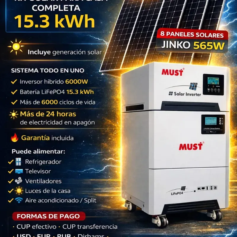 Este sistema incluye 8 paneles solares Jinko de 565W junto con un sistema solar portátil con inversor híbrido de 6000W y batería de litio LiFePO4 de 15.3kWh, capaz de alimentar más equipos y mantener la casa funcionando incluso durante cortes eléctricos largos.