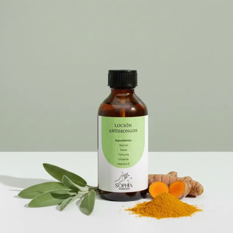 Este tipo de infecciones en los pies y entre los dedos, son más comunes en la época de calor, o en aquellas personas que utilizan calzado cerrado que no transpira adecuadamente o deportivas. Los ingredientes que conforman esta loción son los siguientes: Alcohol, Cúrcuma, Salvia, Glicerina y Vitamina E. Beneficios: Posee un efecto poderoso antifúngico contra diversos hongos, a su vez contiene antioxidantes que contribuyen a la cicatrización de los tejidos y mejoran la salud de la piel. Recomendaciones: No sumergir los pies en el producto, utilizar un aplicador. Contraindicaciones: Alergia demostrada al principio activo de las plantas utilizadas en la elaboración del producto. Modo de uso: Lavar el área afectada y secar bien, posteriormente aplicar la loción prestando especial atención a los espacios entre los dedos. Cantidad: 60ml