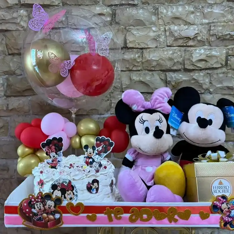 Super bandeja para mi persona favorita ( Bandeja decorada con globo burbuja surtida de panetela con mensaje oculto, pareja de Mini y Miki y caja de bombones Ferrero Rocher )