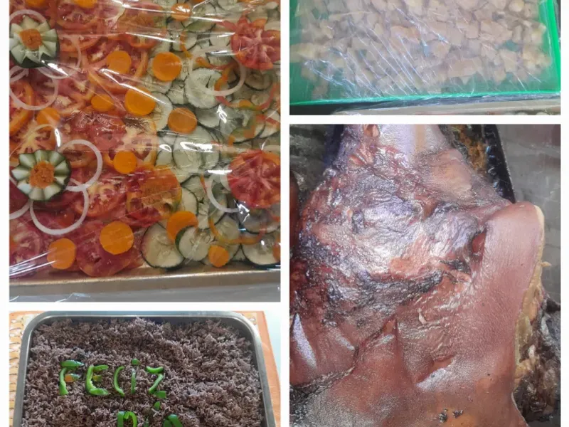 Pernil de cerdo asada. Vianda con mojo. Tostones. Ensalada Mixta. Para 20 comensales. (La vianda y la ensalada pueden variar según la temporada)