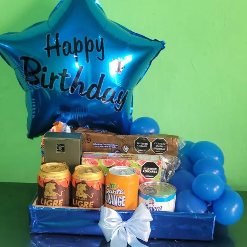Caja grande, 1 perfume, confituras, 1 lata de refresco, 2 latas de malta, 1 leche condensada, borde de globos, globo personalizado.