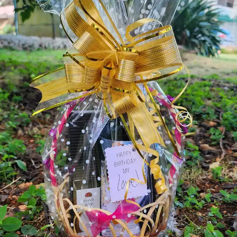 Cesta o caja decorada, 1 botella de vino personalizada, 4 refrescos o maltas( segun disponibilidad), 2 pullovers blanco diseño de pareja,chuches, 1 perfume pequeño.