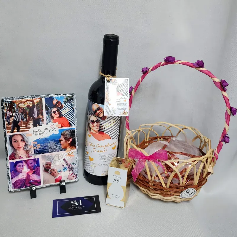 Caja o cesta personalizada ,botella de vino personalizada, photopiedra, perfume pequeño y chuches.