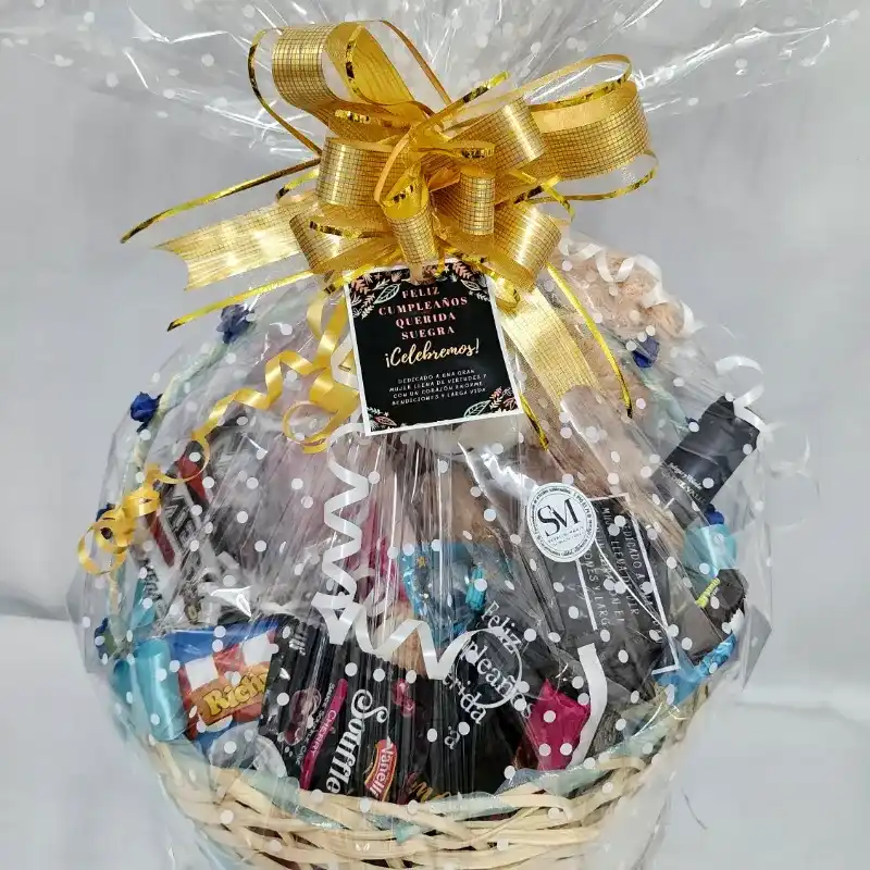Cesta grande decorada , peluche 30 cm, chuches, botella de vino personalizada, jarra personalizada, cristal mediano, 4 malta, 1 juego de shampoo y suavisador, 1 perfume pequeño.