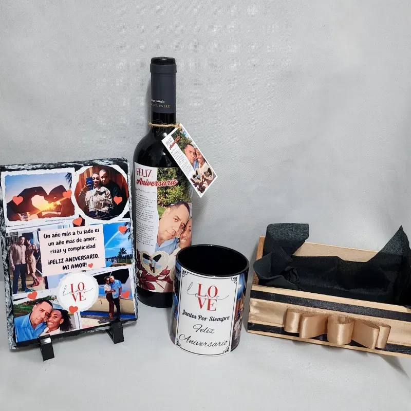 Caja decorada, botella de vino personalizada, jarra,chuches photopiedra.