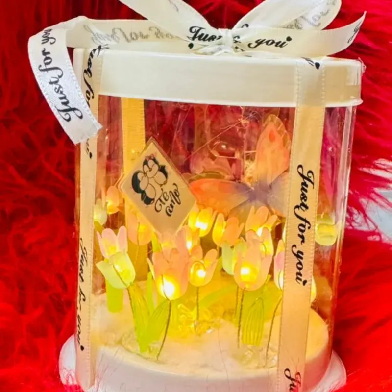 Una delicada caja decorativa que encierra un hermoso jardín de tulipanes iluminados, creando un ambiente cálido y mágico. Su diseño transparente permite apreciar cada detalle, convirtiéndola en el regalo perfecto para sorprender en cualquier ocasión. Ideal para decorar espacios y transmitir amor, elegancia y ternura en un solo detalle.