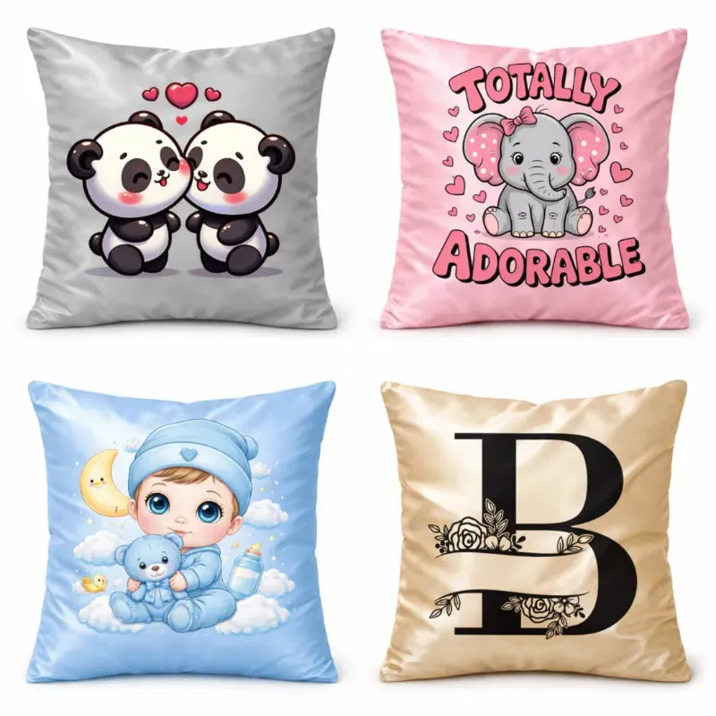 Cojines satinados personalizados en colores variados: dorado, plateado, rosado y azul ✨. Suaves, brillantes y elegantes, con el diseño que tú elijas para convertir cualquier espacio en algo único y con estilo. 🖤