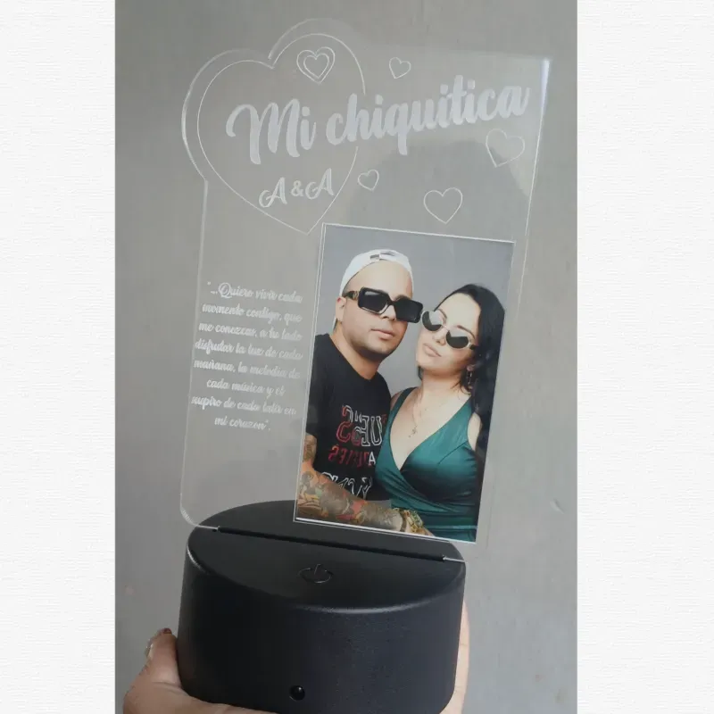 Lámparas de acrílico cifrado a láser, puede incluir fotos si lo desea , todo el diseño es totalmente personalizado.Incluye mando a distancia. Varios cambios de luces y colores y cable usb