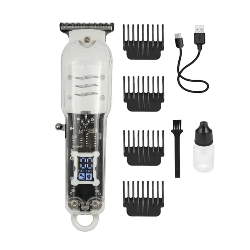 La rasuradora/cortadora de cabello profesional Buytiti MR-113 es un dispositivo inalámbrico y recargable, caracterizado por su cuerpo semi-transparente, diseño compacto y pantalla digital LCD para monitorear la batería. Utiliza carga USB Type-C, incluye cuatro peines guía y cuchillas de alta precisión.