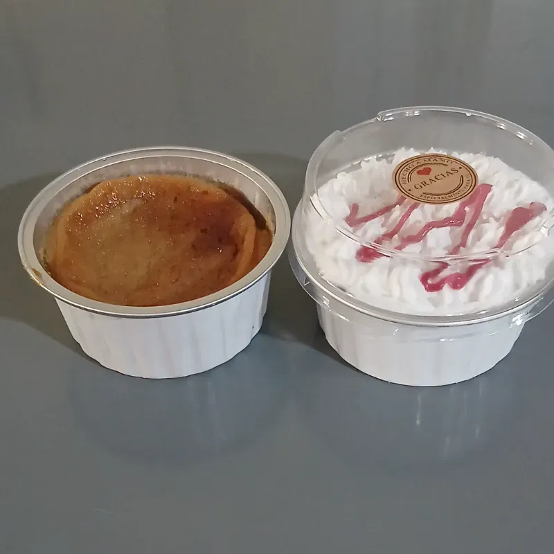Flan decorado con crema chantilly y frambuesa o dulce de leche. Presentación en envase de aluminio horneable