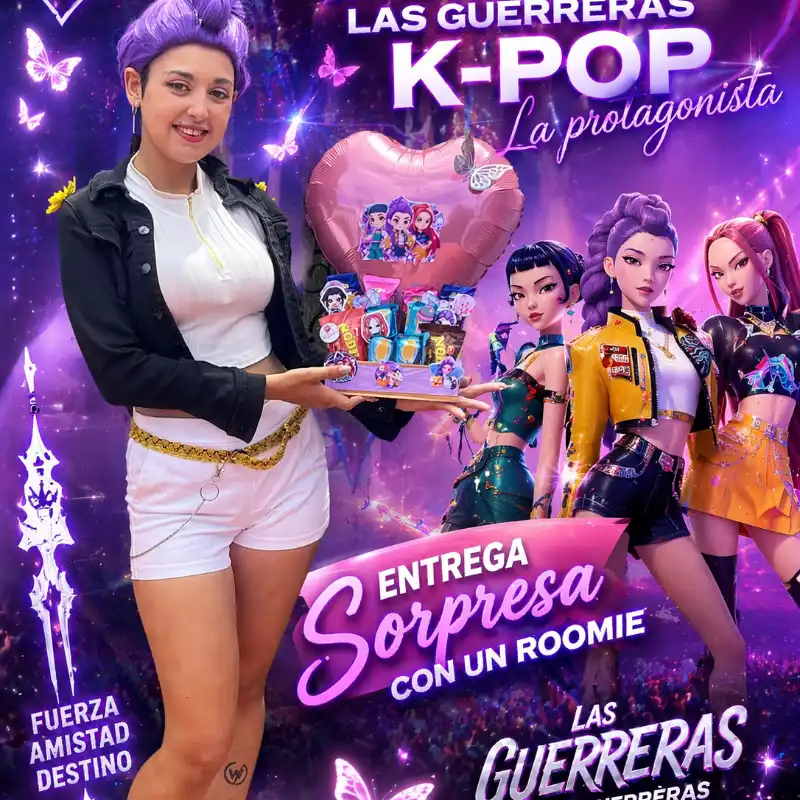 Entrega sorpresa con la guerrera K-pop Roomie 💜✨ donde la magia, la alegría y el estilo se unen para crear un momento inolvidable. Incluye lluvia de pétalos de rosa, confetti, música a selección, fotos y videos editados, una hermosa dedicatoria y pinta carita, todo pensado para que vivas una experiencia única llena de energía, diversión y encanto. 🌸🎶