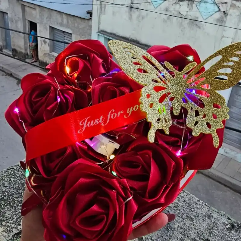 Caja regalo en forma de corazón con flores eternas y delicadas luces cálidas que iluminan cada detalle. Un símbolo de amor que perdura en el tiempo.