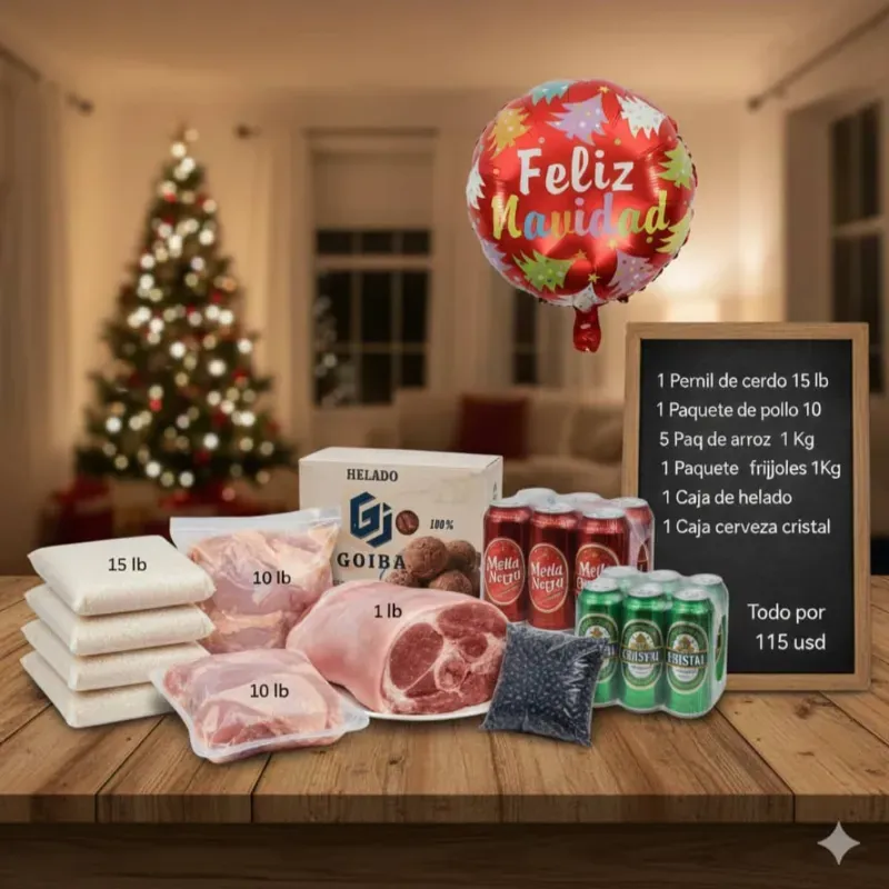 1 Pernil de cerdo 15 lib 1Paquete de pollo 10 lib 5 Pqts arroz de 1kg 1 pqt Frijol de 1kg 1 caja de helado 1 caja de cerveza cristal