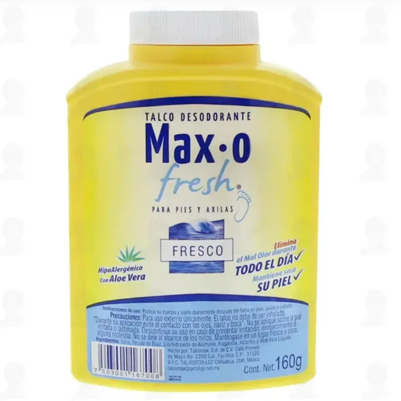 Talco Desodorante Max-O Fresh para pies y axilas aroma a fresco Formato: 160g
