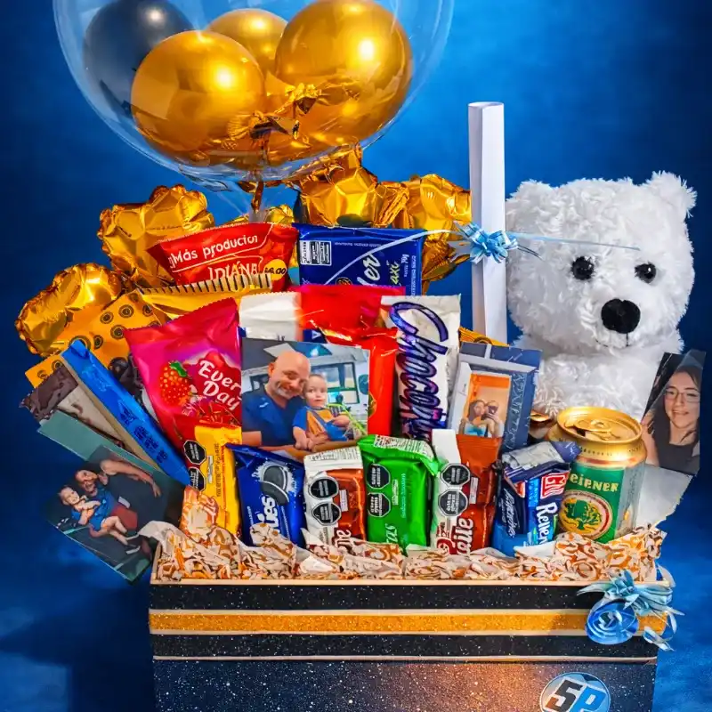 Una cajita personalizada, con fotos familiares y con más de 15 chuches , globos y un mensaje