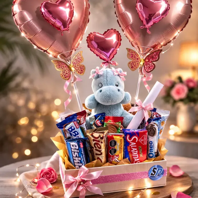 Esto es una cajita personalizada con globos con mensajes y más de 20 chucherías .( Que pueden ser q su elección )