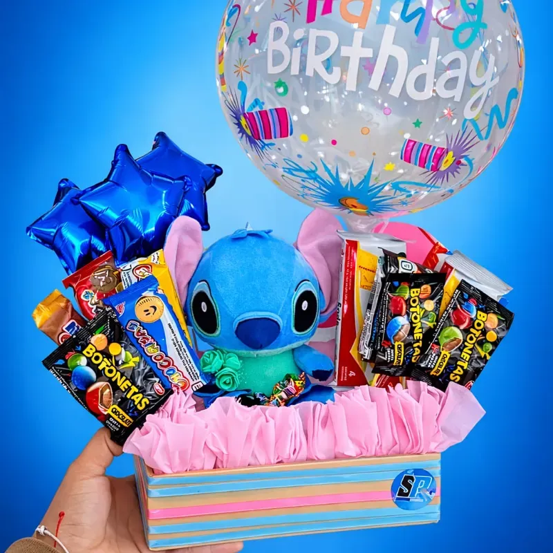 Consiste en una cajita con un peluche , globos y chuches