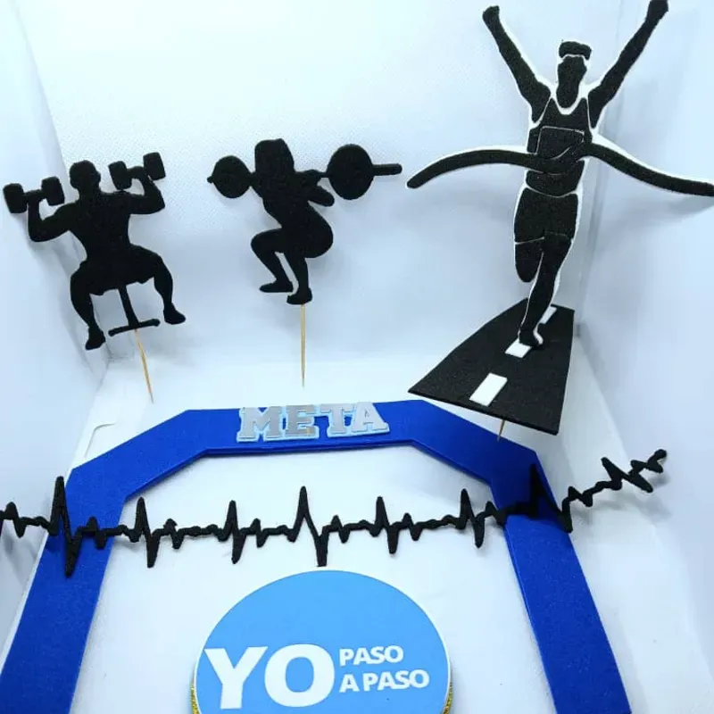 Meta: 16.7cm de altura x 19 cm de largo Círculo frontal: 8.56 cm Corredor: 12.5cm de altura x 11.6 cm largo Pesistas: 7.7 cm de altura Frecuencia cardíaca: 2 x 26 cm de largo