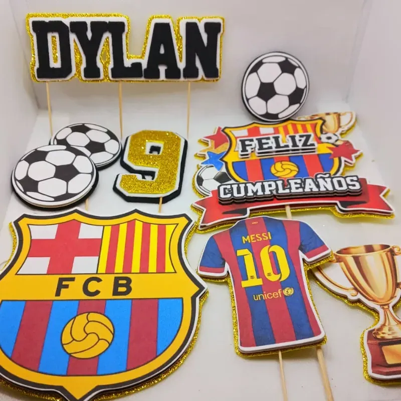 Nombre: 4.3 cm de altura Escudo FCB: 12.4cm de altura x 11.7cm de ancho Cartel Feliz Cumpleaños: 11.3cm de altura x 12 cm de largo Copa: 8 cm de altura x 6.2 cm de ancho Camiseta: 8.6cm de altura x 7.3cm de ancho Número: 7.3cm de altura