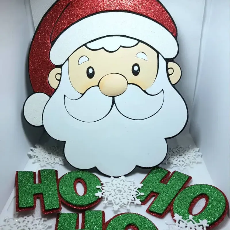 Santa Claus: 25cm de altura x 20.7 cm de ancho Ho Ho Ho: 7.7 cm de altura x 10cm de largo 5 copos de Nieve: 6cm Todas las figuras tienen cinta doble contacto detrás para pegar en superficies como puertas, paredes, cristales etc.