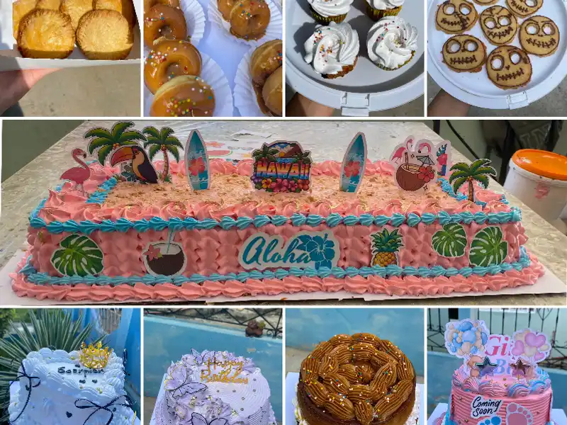 Consiste en: ➡️Una mini torta rellena con leche condensada hervida ➡️3 cupcakes rellenos con la masa sabor vainilla ➡️6 mini donas bañadas con leche condensada hervida