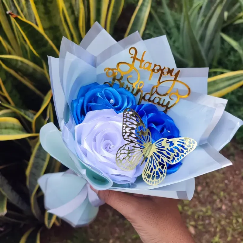 Ideal para un detalle especial. Con su belleza única deslumbra a la persona que lo recibe. Contiene: 3 rosas grandes de 18 pétalos Envoltura de papel coreano Centro de rosas Topers y mariposa
