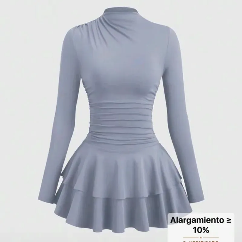 Vestido azul grisáceo es un modelo de manga larga y cuello alto con un diseño ajustado en la cintura y una falda plisada de dos niveles.