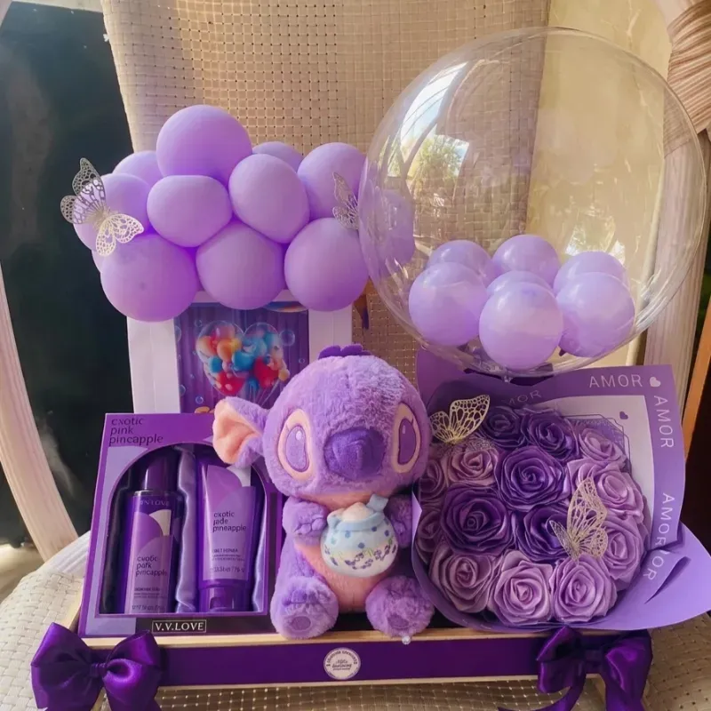 Bandeja decorada con peluche de 20 cm, ramo de 20 rosas, estuche de perfume y crema
