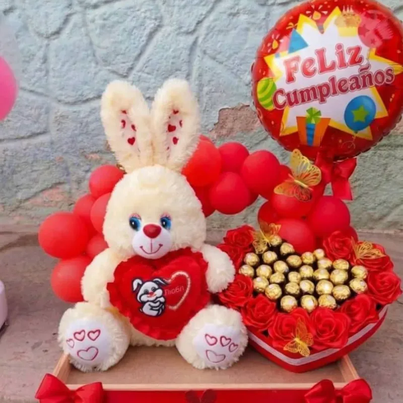 Caja decorada con peluche de 25 cm , caja forma de corazon con rosas y bombones ( no son ferrero)