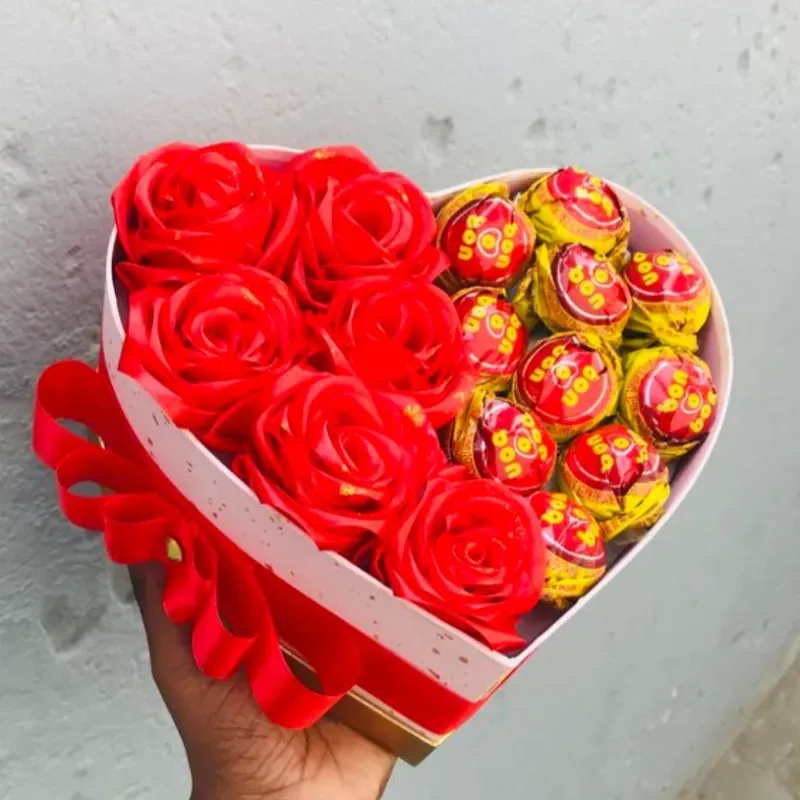 Cajita pequeña forma de corazon con rosas y bombones Bon Bon