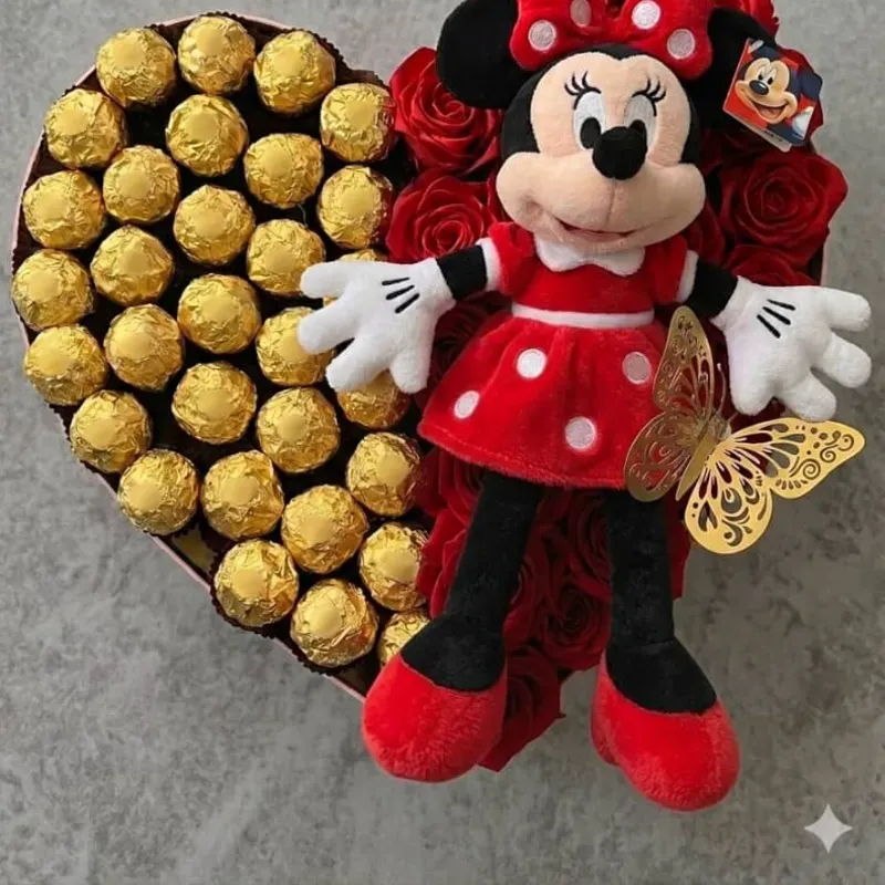 Caja forma.de corazon , con peluche de mini de 25 cm , rosas eternas, bombones ( no son ferrero)