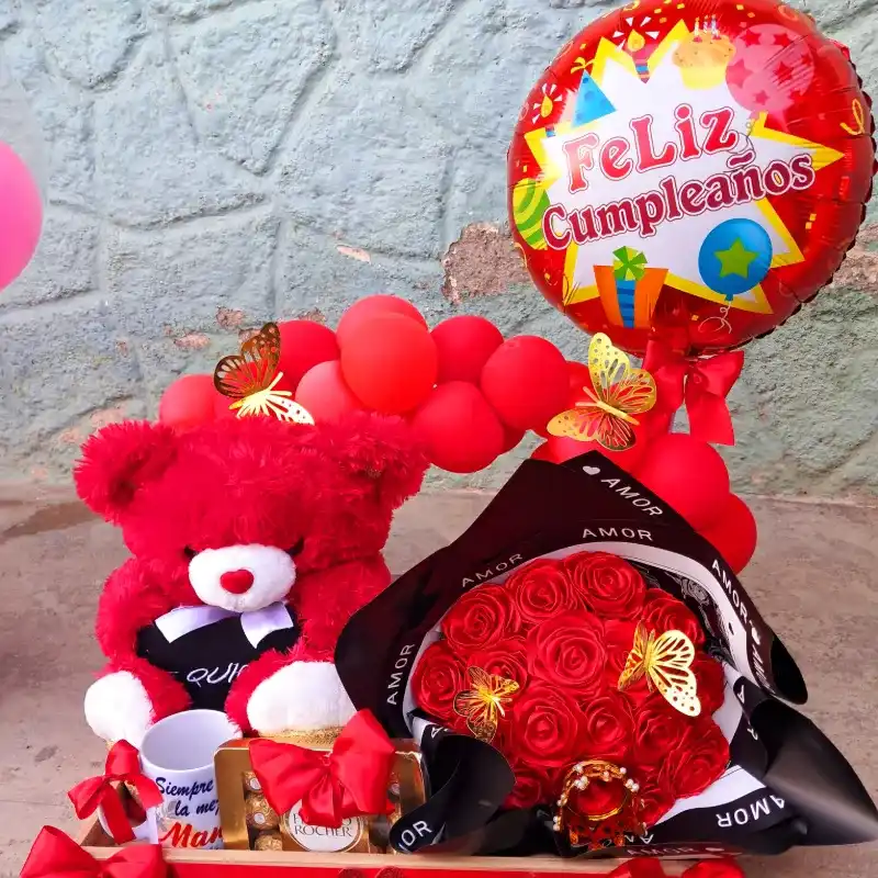 Bandeja con peluche de 25 cm, estuche de bombones, perfume, ramo de flores y jarra