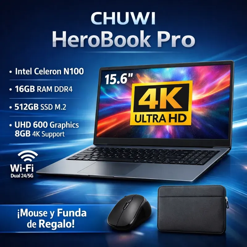 ⭐️ALTA PUNTUACIÓN EN AMAZON⭐️ ✅ Pantalla IPS Full HD de 15.6”, ideal para llevar a todas partes. Procesador ⚙️ Intel Celeron N100, 🧠 16GB RAM DDR4 , 💾 512GB SSD M2, y Video 8GB gráficos 🎞️ UHD 600 con soporte 4K. Conectividad 📶 Wi-Fi dual 2.4/5G, touchpad amplio. NUEVAS FUERA DE CAJA 0KM usted las inicia por primera vez 🎁 Mouse y Funda de Regalo 🎁