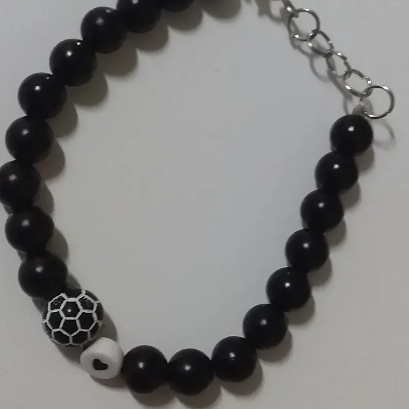 Pulsera de perlas negras con balón de futbol ideal para un regalo para esa persona especial que sabes que ama el futbol. Si desea hacer otra temática en cuanto a algún nombre de equipo jugador o frase puede hacer su descripción y añadir algún artículo en la sesión EXTRA