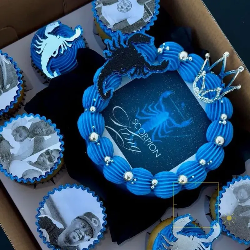 Minitortas de 20 cm de ancho acompañada de 8 cupcakes, decoraciones con papel comestible, corona y perlas de alta gama