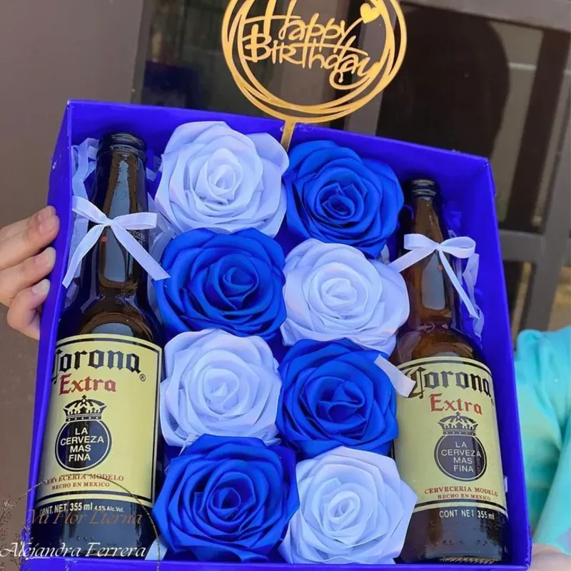 Cajita personalizada con cerveza incluida y flores, color a su elección