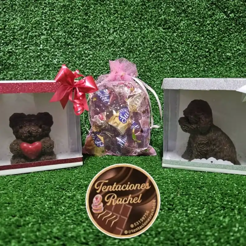 Perrito de chocolate oscuro en caja Osito de chocolate oscuro con corazón Bolsita de 10 bombones surtidos y rellenos