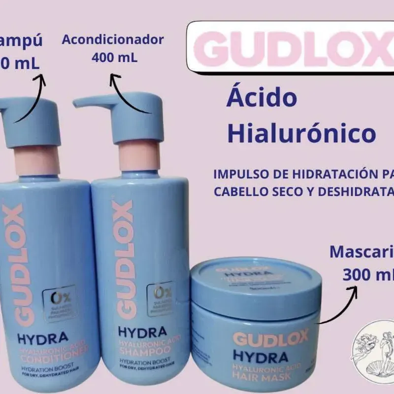 El set GUDLOX HYDRA con Ácido Hialurónico es la solución perfecta para devolverle la vitalidad al cabello seco y deshidratado. Diseñado para ofrecer un impulso intensivo de hidratación, este trío combina: