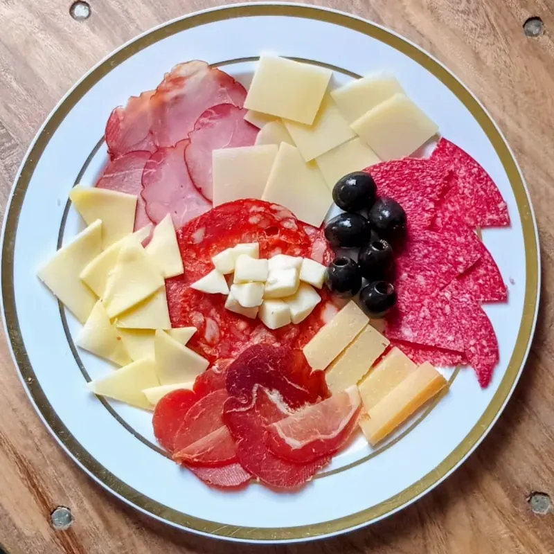 Montado para llevar cuenta con 3 tipos diferentes de queso, 3 tipos diferentes de charcutería y aceitunas
