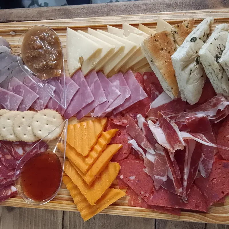 Tabla de 30*20cm contiene 3 tipos de quesos, jamón serrano, lomo embuchado, chorizo, crujientes, frutos secos y confitados