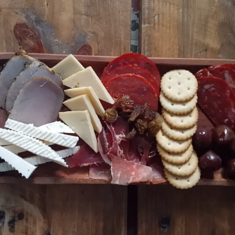 Tabla de 25*10 cm contienen 2 tipos quesos, charcutería, crujientes frutos secos y confitados