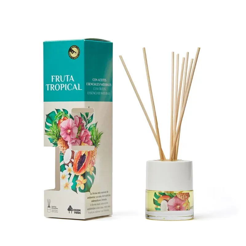 Son ambientadores de varitas Bosque Verde. Las fragancias disponibles son "Fruta Tropical" y "Bambú". El aroma de Fruta Tropical evoca piña, manzana, coco y aceite de monoï.Es un ambientador de esencia fresca y herbal con notas olfativas cítricas y un toque de té verde. El sistema funciona por evaporación, liberando la fragancia progresivamente a través de las varillas de madera.