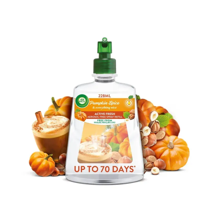 El artículo es un repuesto de ambientador Air Wick Active Fresh Pumpkin Spice. Sus características clave son: Aroma de especias de calabaza. Formato en aerosol sin propelentes. Dura hasta 70 días (en la configuración mínima). Contiene 228 ml de producto.