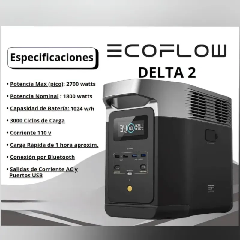 • Marca: Ecoflow Delta 2 • Potencia Max_ (pico): 2700 watts • Potencia Nominal : 1800 watts • Capasidad de Batería: 1024 w/h • 3000 Ciclos de Carga • Corriente 110 v • Carga Rápida de 1 hora aproxim. • Conexión por Bluetooth • Salidas de Corriente AC y, Puertos USB • Garantía: 1 semana